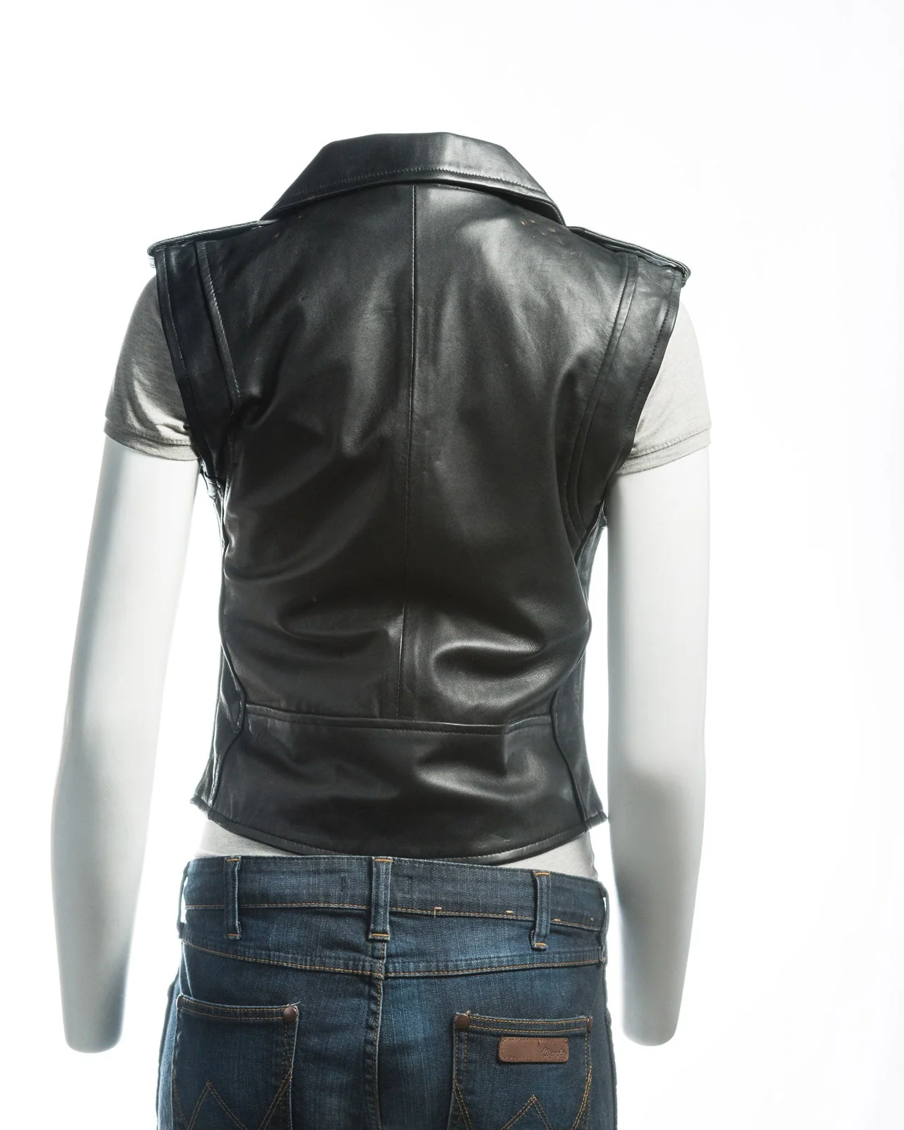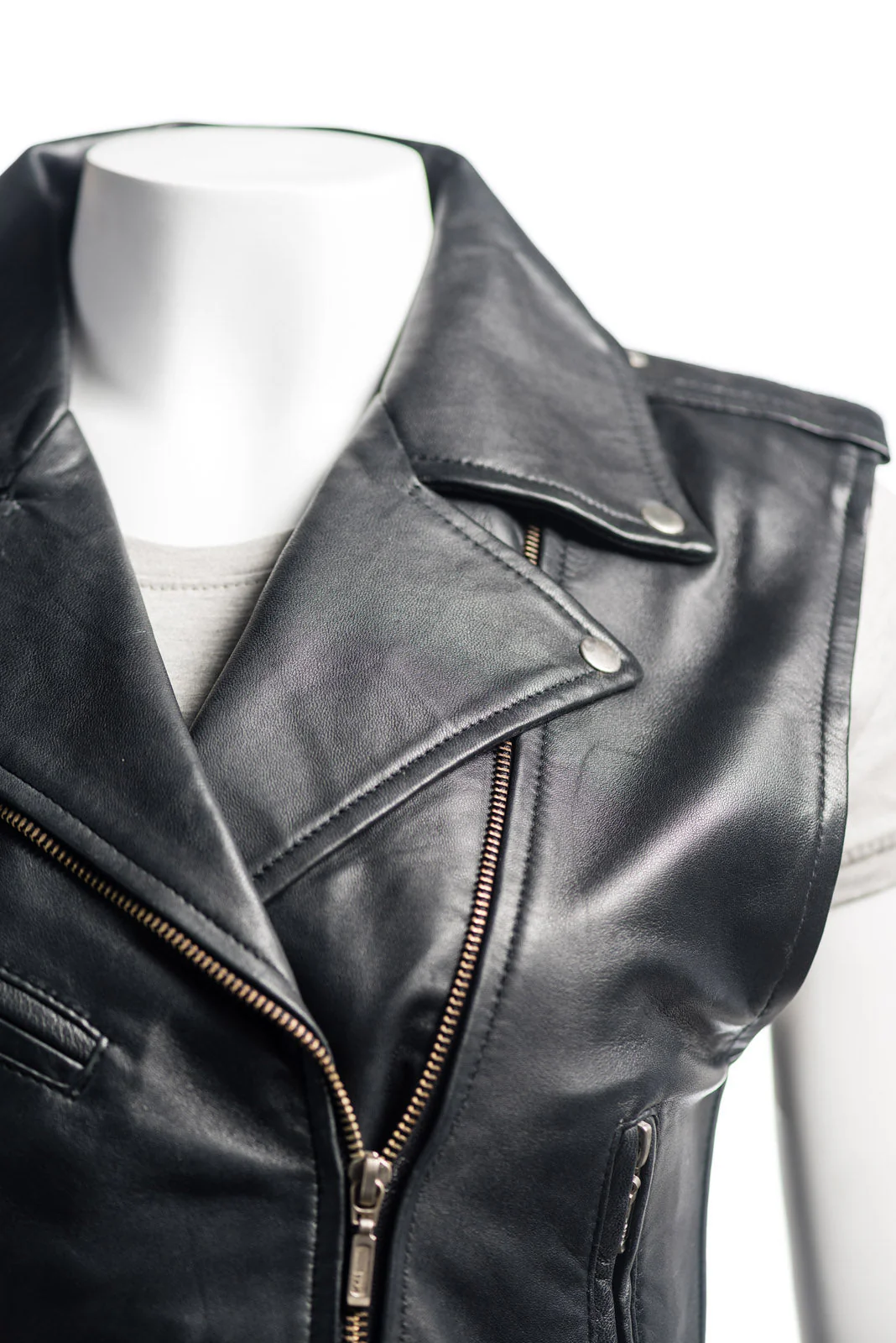 A modern and stylish reinterpretation of the classic Brando-style biker jacket, expertly redesigned into a leather biker waistcoat. This slim-fit waistcoat retains the iconic revere collar with stud fastening, zipped side pockets, a stud-fastened front pocket, and a buckled waist belt, preserving the authentic biker aesthetic.